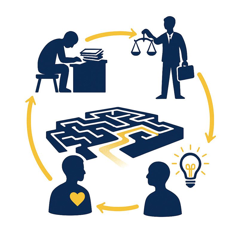 On one side: a system that was meant to serve people — yet often distances them from justice.